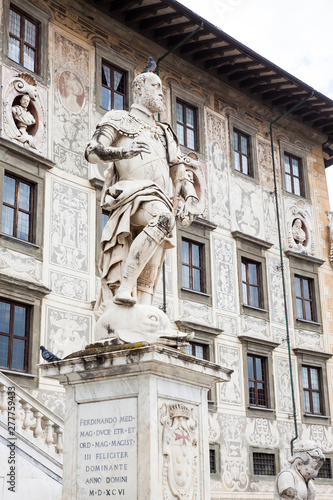 Obraz premium The statue of Cosimo I de Medici in front of Palazzo della Carovana built in 1564 located at the palace in Knights Square in Pisa