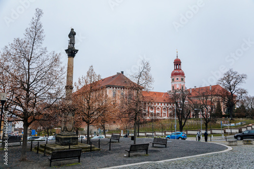 © AnnaRudnitskaya, Obraz premium The statue of the Saint Laurel (sv. Vavrince) on the Charles town square (Karlovo namesti) near romantic baroque castle in Roudnice nad Labem, Central Bohemia, Czech Republic