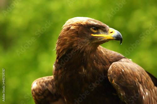 © Honza Hejda, Obraz premium The steppe eagle (Aquila nipalensis) up to close. Steppe eagle portrait. Green background.