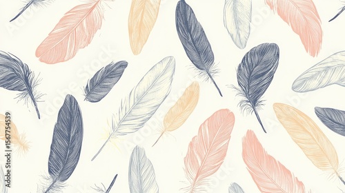 Obraz premium The stock photo shows a seamless pattern of soft pastel hand-drawn feathers.