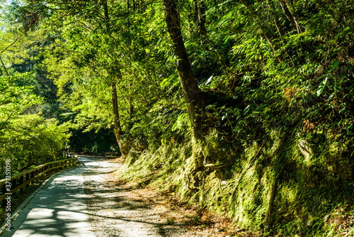 Obraz premium The stone pathway through in the green forest in Taiwan.