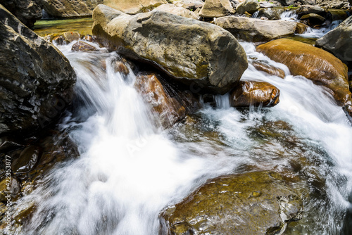 © BINGJHEN, Fototapeta premium The stones under the waterfall, close-up waterfall as background.
