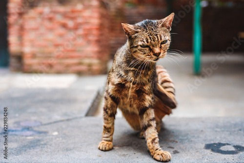 © Lianna Art, Naklejka premium the street homeless tobby cat scratching himself in the yard of the monastery