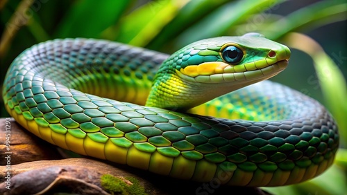 © evastar, Fototapeta premium The striking green snake elegantly rests on a branch, showcasing its vivid scales against a backdrop of rich greenery, embodying nature's beauty