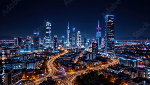 Fototapeta premium The striking image depicts a vibrant smart city illuminated against a dark blue backdrop