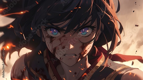 Fototapeta premium the strongest female warrior who fights persistently despite major injuries, japanese anime style illustration. generative AI