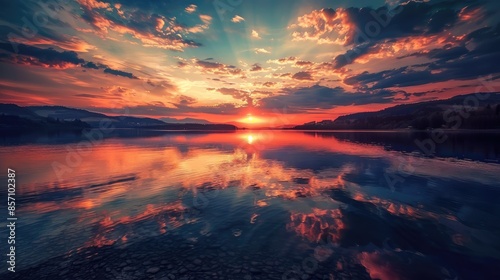 © Emin, Fototapeta premium The stunning and peaceful sunset scenery over the lake