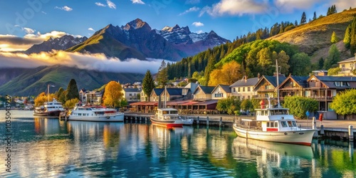 Naklejka premium The stunning landscape of Queenstown features Lake Wakatipu, dotted with boats and buildings near the wharf, creating a captivating scenic view.
