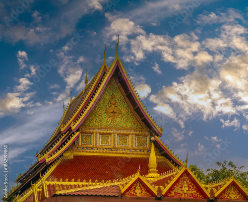Naklejka premium The stunning roofs of the Wat Ong Teu Mahawihan temple (Temple of the Heavy Buddha), Vientiane, Laos.