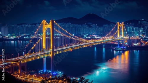 Naklejka premium The stunning view of the Gwangandaegyo Bridge in Busan, lit up at night,...