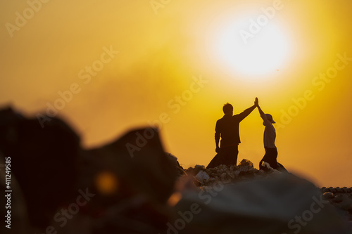 Fototapeta premium The success of the poor and happy In the garbage collection for sale People living in the heap walk to collect recyclable waste to sell to World Environment Day poverty concept.