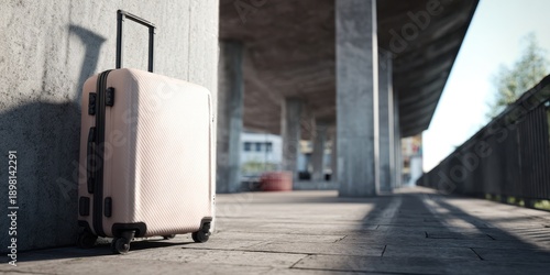 © Studio Nova, Obraz premium The suitcase waiting alone on an urban concrete walkway beneath a modern overpass
