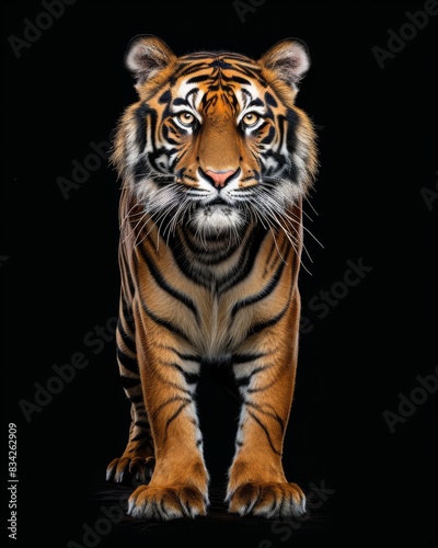 Fototapeta premium the Sumatran Tiger, portrait view, white copy space on right Isolated on black background