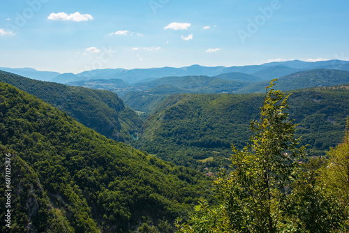 © dragoncello, Fototapeta premium The summer landscape in the hills overlooking Martin Brod, Bihac, in the Una National Park. Una-Sana Canton, Federation of Bosnia and Herzegovina. Early September
