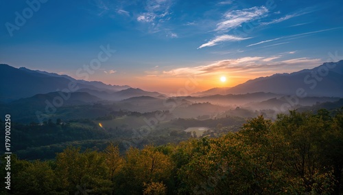 © ArtificialHorizons, Obraz premium The sun ascends amidst mist and mountains in the early hours, morning haze