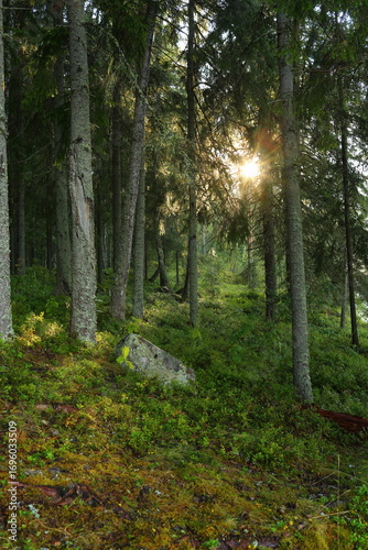 © Romulenoc 777, Fototapeta premium The sun breaks through the forest with a stone in the foreground in summer