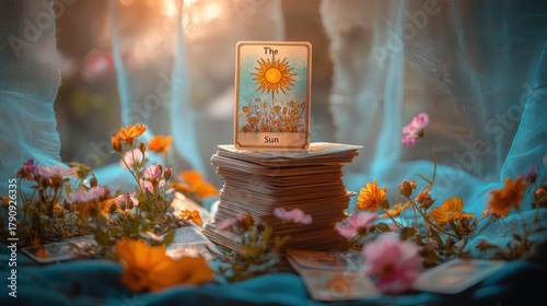 © Natalia, Fototapeta premium The "Sun" card sits atop a deck of cards, surrounded by flowers and a light blue cloth. AI.