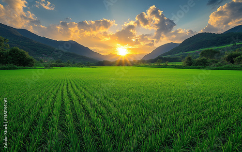 Fototapeta premium the Sun casts golden rays over lush green rice terraces, with the mountains forming a breathtaking backdrop. The vibrant landscape captures the peaceful beauty of rural farming and nature at its peak.