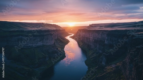 © Anna, Fototapeta premium The sun descends beyond a canyon, where a river meanders between the distant mountain range