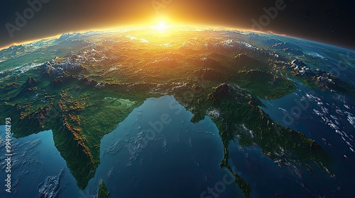 Fototapeta premium The sun illuminates East Asia from space, with a physical map highlighting the Himalayas, India, and China.
