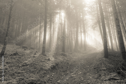 © TonelloPhotography, Naklejka premium the sun inside a woods in a foggy day