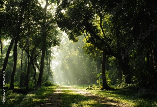 Obraz premium The sun is brightly shining through the trees in the vibrant forest