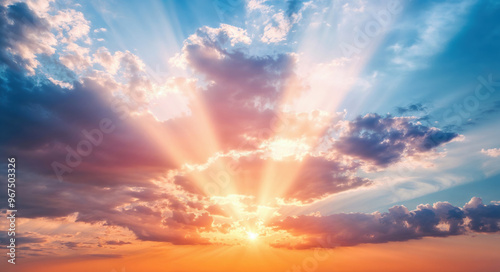 © oksa_studio, Obraz premium The sun is setting behind the clouds, creating a beautiful orange glow. High quality photo