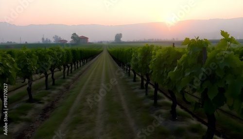 © KWY, Naklejka premium the sun is setting over a field of vines