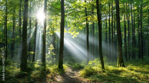 © Formoney, Obraz premium The sun is shining through the trees, casting a warm glow on the forest floor