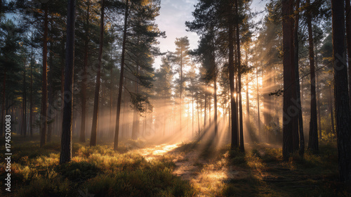 © PhotoStudioWizard, Fototapeta premium The sun is shining through the trees, casting a warm glow on the forest floor