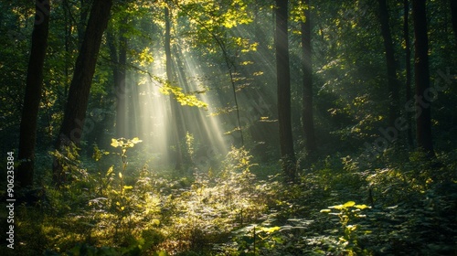 © Oulailux, Obraz premium The sun is shining through the trees, casting a warm glow on the forest floor