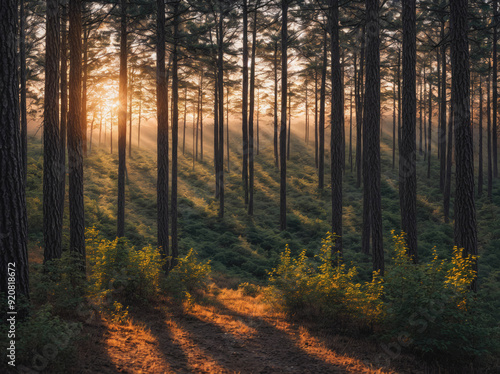 Obraz premium The sun is shining through the trees, casting a warm glow on the forest floor