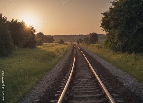 © Алексей Ковалев, Fototapeta premium The sun is slowly setting behind the distant train tracks in view