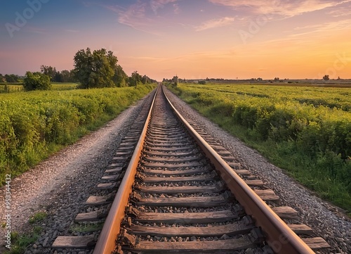 © Алексей Ковалев, Fototapeta premium The sun is slowly setting behind the distant train tracks in view