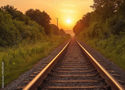 © Алексей Ковалев, Fototapeta premium The sun is slowly setting behind the distant train tracks in view