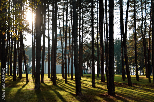 Obraz premium the sun rays through the trees in the forest