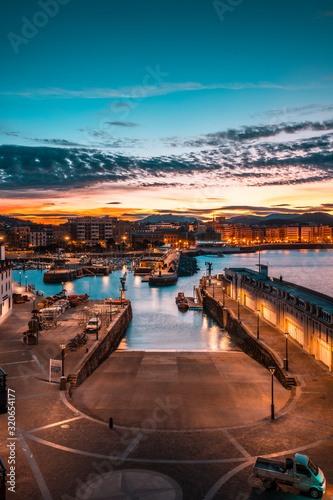 © unai, Fototapeta premium The sun rises at dawn from the port of San Sebastian city. Basque Country
