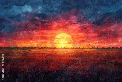 © Evdoha, Obraz premium the sun rising over the fields in an abstract watercolor style,