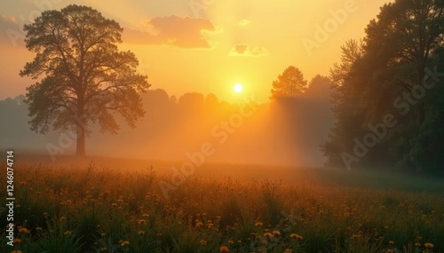 © AiGallery, Fototapeta premium The sun's golden rays peek through the misty veil of morning fog, mist, warm tones