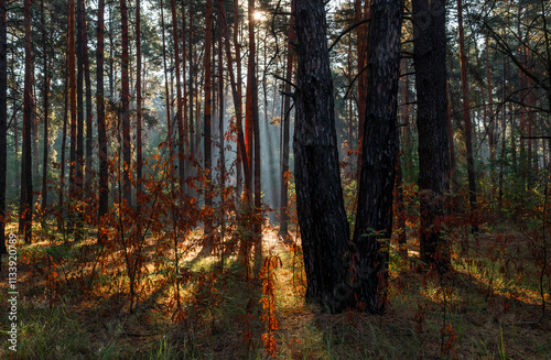 © Mykhailo, Fototapeta premium The sun's rays are breaking through the tree branches. Nice, sunny weather for hiking in nature.