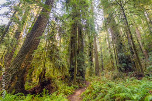 © khomlyak, Obraz premium The sun's rays fall through the leaves. Fairy green forest.Huge sequoias on the background of the blue sky. Redwood national and state parks. California, USA