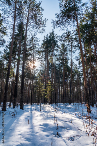 Fototapeta premium The Sun's rays pass through the trees in winter forest
