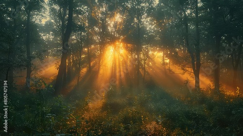 Naklejka premium The sun's rays pierce through the dense forest canopy, illuminating the...