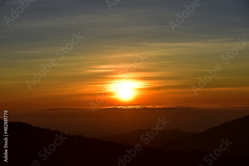 © tharathip, Fototapeta premium The sun set behind thick forests followed by mountains.