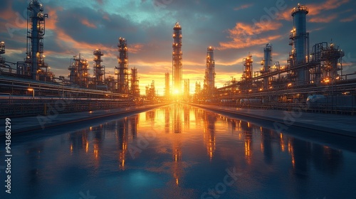 © Emiliia, Fototapeta premium The sun sets behind an industrial complex, illuminating carbon capture structures and reflecting in nearby water.