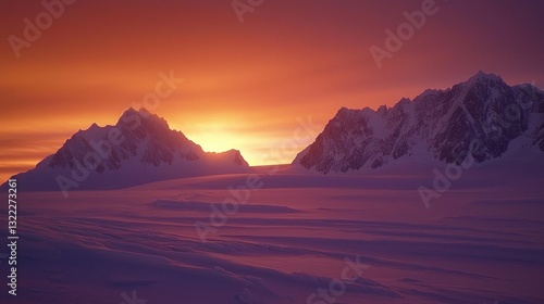© Formoney, Naklejka premium The sun sets behind towering mountains, painting the sky with vivid colors. Snow blankets the ground, highlighting the serene beauty of the winter landscape
