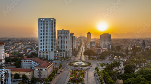 © Dong, Fototapeta premium The sun sets or rises behind buildings in Thai Nguyen city, casting a warm glow over the central roundabout and urban area.