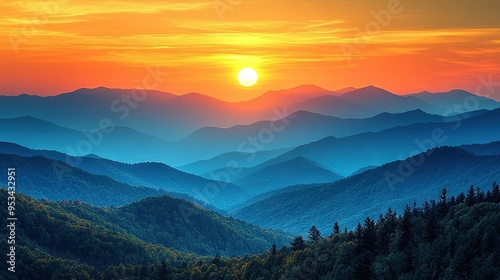 © Olga, Obraz premium The sun sets over mountainous valley trees, with a forest in the background