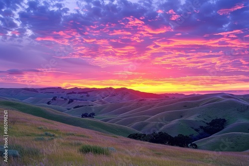 Fototapeta premium The sun sets over the hills and valleys, casting a vibrant glow across the landscape, A vibrant sunset over rolling hills