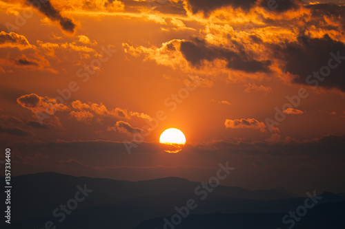© 子程 龚, Obraz premium The sun sets over the mountains at dusk